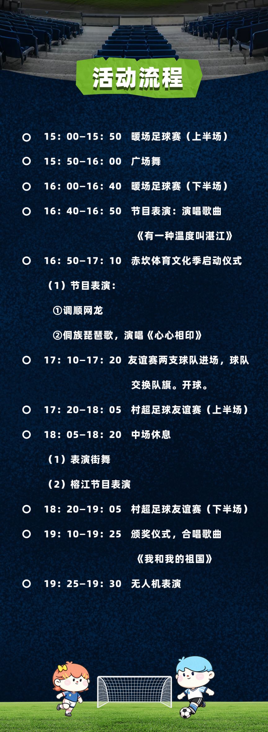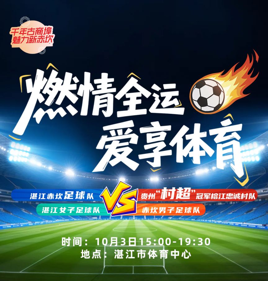 【导语】:湛江赤坎足球队VS贵州“村超”冠军榕江县忠诚村队(交流活动)将于10月3日16:50-19:30在湛江市体育中心足球场举行,免费预约入场,预约流程详见下文: