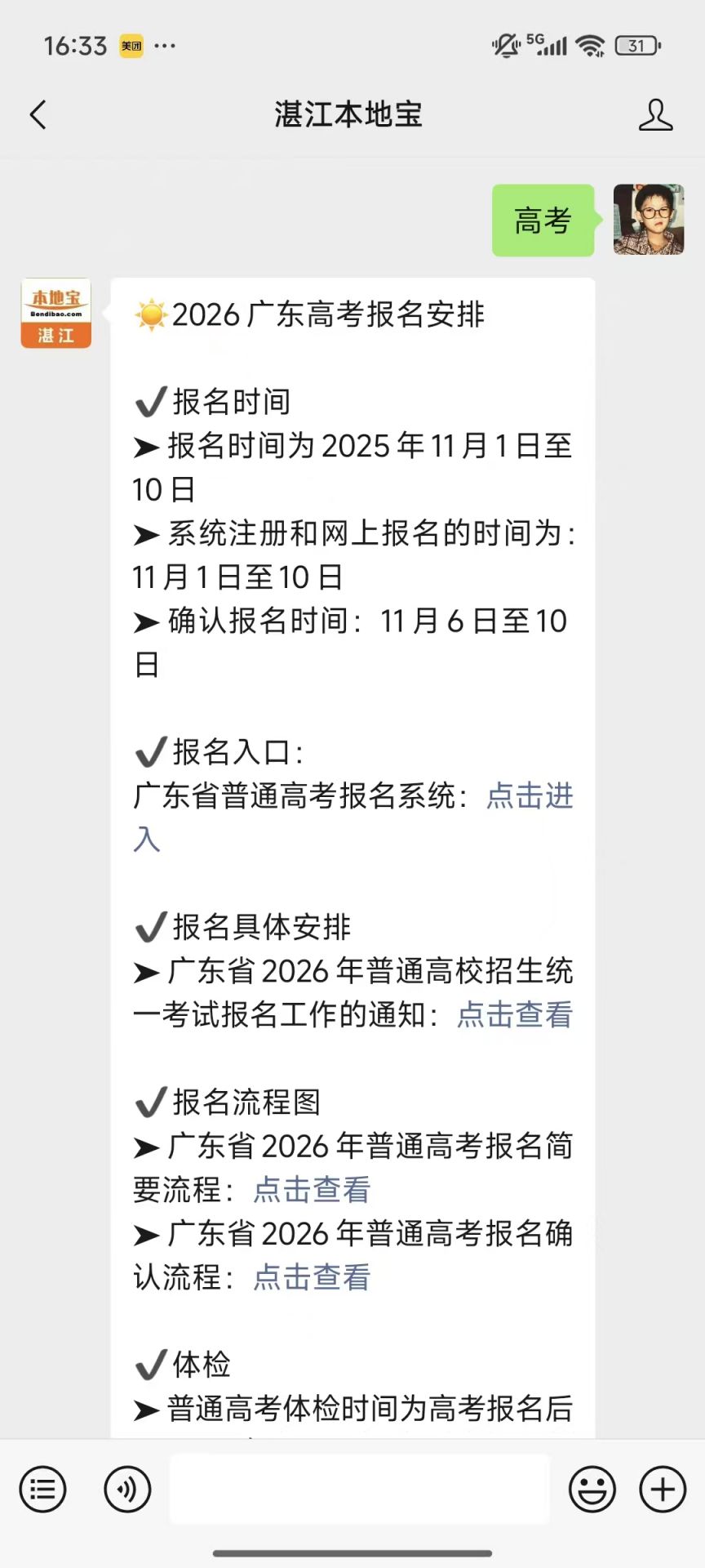 温馨提示:微信搜索公众号【湛江本地宝】,关注后在对话框回复【高考】即可获取2026年广东高考报名时间、报名入口、报名流程图、广东省2026高考报名安排等资讯!
